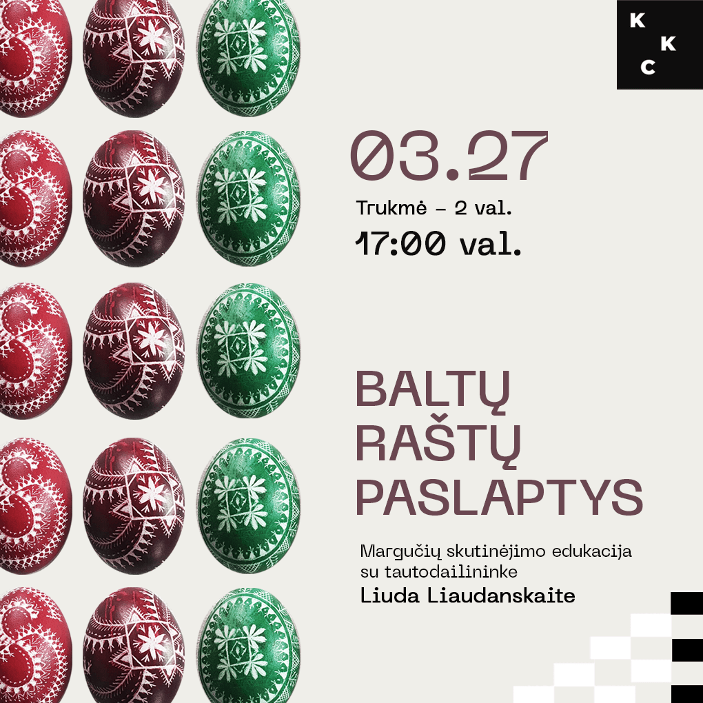 Kovo 27 d. 17 val. Kauno kultūros centre tautodailininkė Liuda Liaudanskaitė atvers margučių raštų simboliką ir padės atrasti baltų ženklų prasmę. Edukacijos metu dalyviai sužinos, kokiais raštais senoliai puošė margučius, ką reiškia saulutės, žalčiukai, gyvybės medžiai ir kiti simboliai, saugantys šimtametę protėvių išmintį. Taip pat išmėgins skutinėjimo techniką ir sukurs savitą, tradicijų įkvėptą margutį.